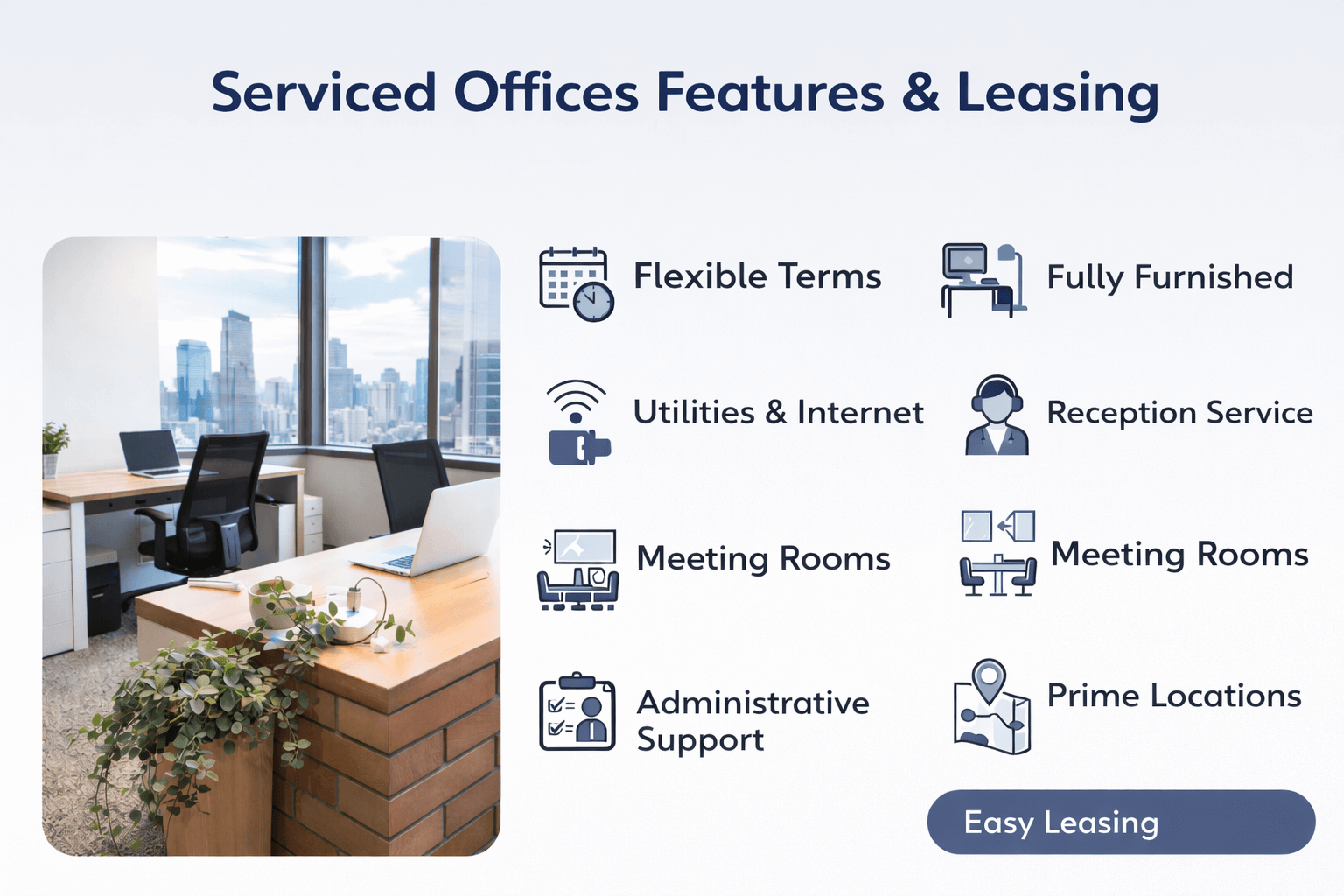 服務式辦公室是指已整合辦公空間、家具設備、網路、清潔、會議室與部分行政服務的租賃型辦公室,企業可在較短時間內直接進駐使用。